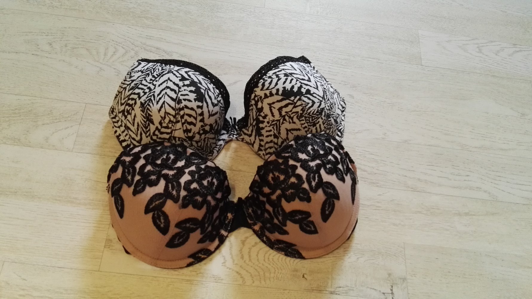 Nudefarbener Bh mit Blattmuster und Tattooeffekt auf der Haut am Rand sowie kleiner Schleife in der Mitte.