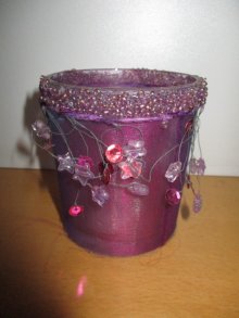 Kerzenglas mit einem dünnen Stoff ummantelt und mit Perlen etc. verziert