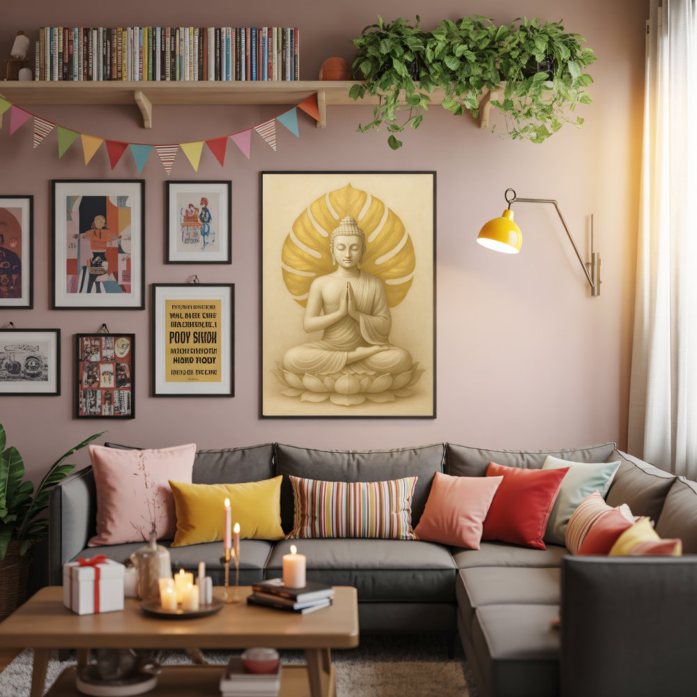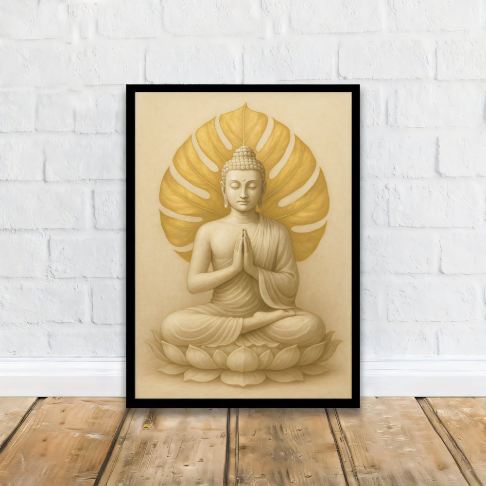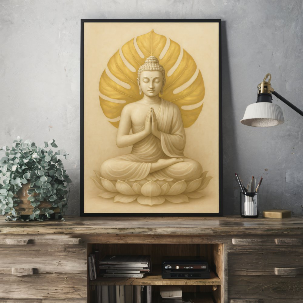 Beruhigendes, spirituelles Digitalposter mit einem meditierenden Buddha vor goldenem Blattmotiv. Die warmen Beige- und Goldtöne schaffen eine harmonische, ruhige Atmosphäre und passen perfekt in Wohnzimmer, Schlafzimmer, Yoga- oder Meditationsraum. Ein zeitloses Motiv für alle, die Achtsamkeit, Ruhe und Ästhetik lieben – auch ideal als Geschenk.