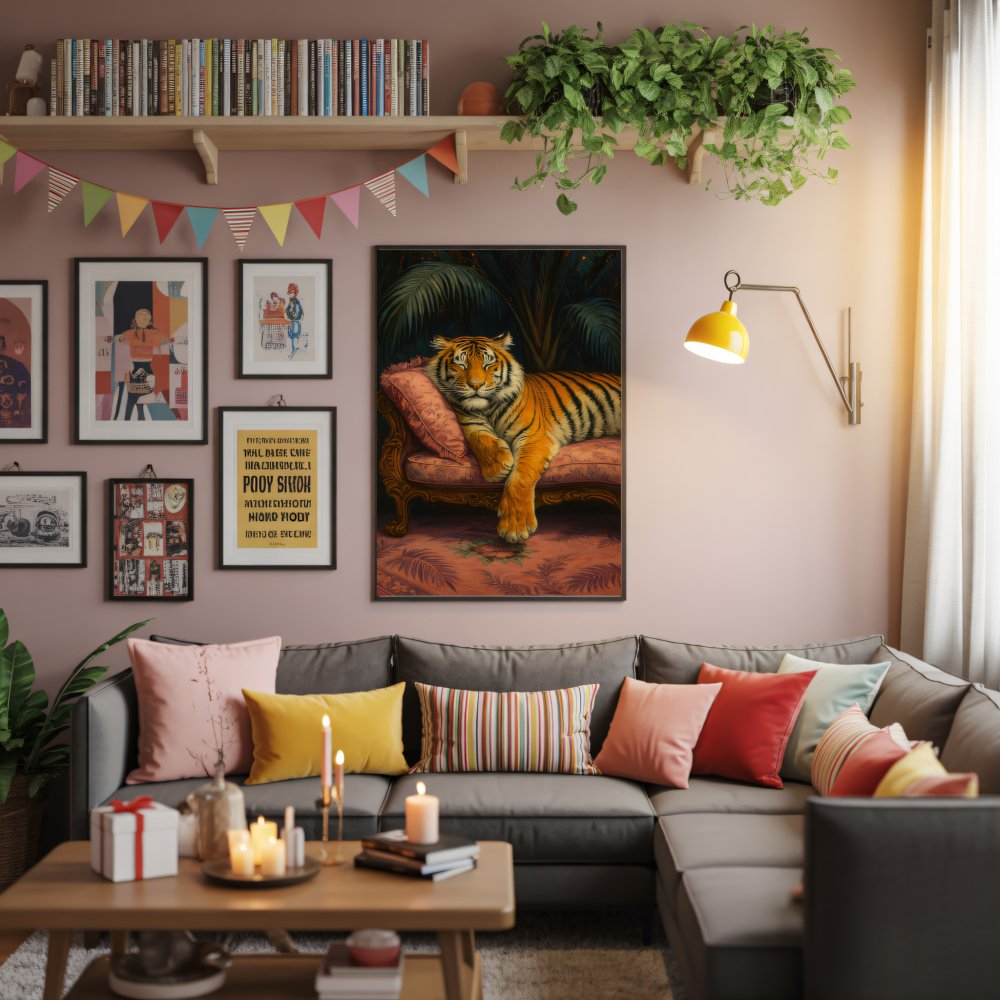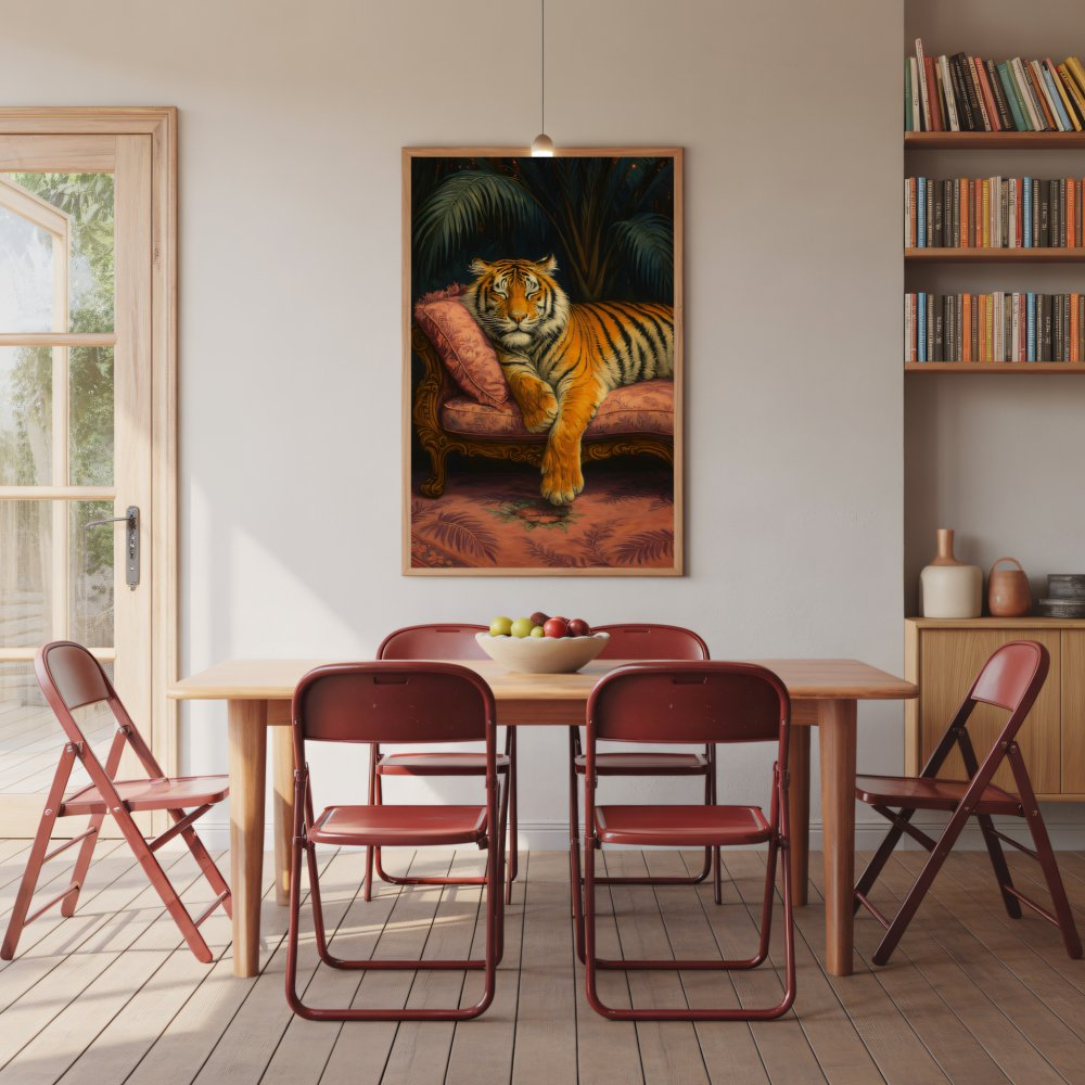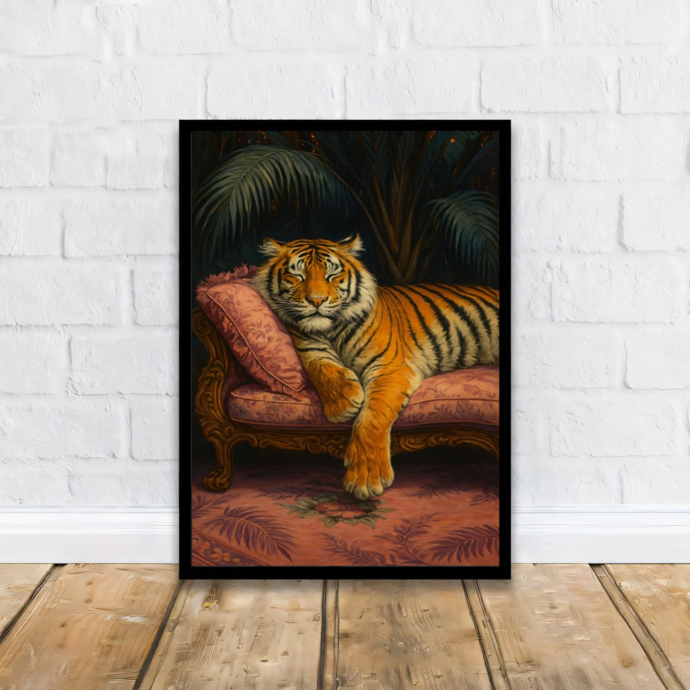 Edles, außergewöhnliches Digitalposter mit einem entspannt schlafenden Tiger auf einem romantischen Vintage-Sofa, umgeben von dunklem Dschungelgrün. Die warmen Orange- und Rosatöne des Tigers und der Polster treffen auf einen geheimnisvollen, tropischen Hintergrund – luxuriös, ruhig und ein echter Blickfang. Perfekt für stilvolle Wohnräume, Schlafzimmer, Boutique-Einrichtungen oder als besonderes Geschenk für Tier- und Kunstliebhaber.