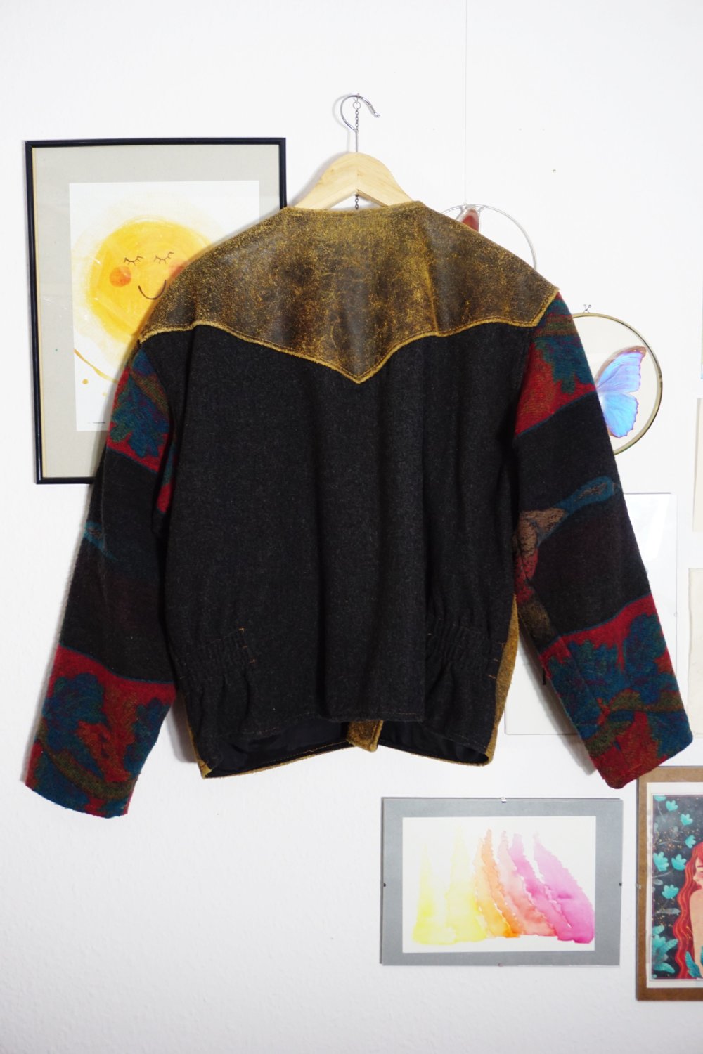 Vintage Ethno Lederjacke Navajo bunt Webstoff Aztec Sherpa L XL Wollstoff Muster