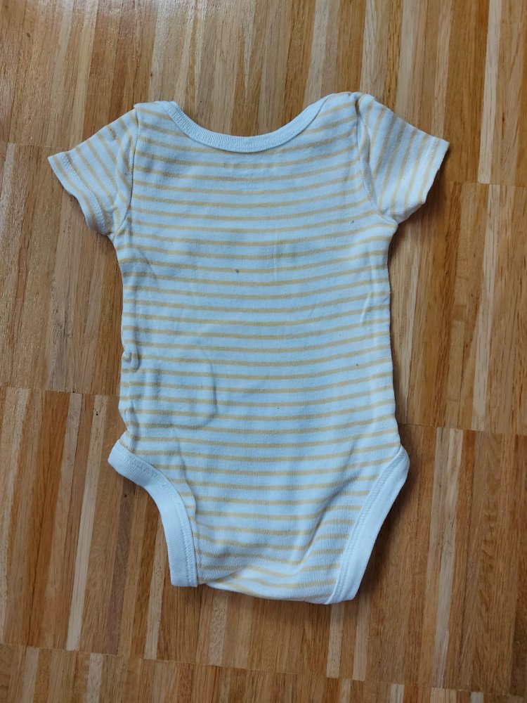 weiß-gelb gestreifter Kurzarm-Body mit dem Spruch "Daddy's shining star". Er hat einen dehnbarem amerikanischen Ausschnitt und ist aus 100% Baumwolle. Tadelloser Zustand.