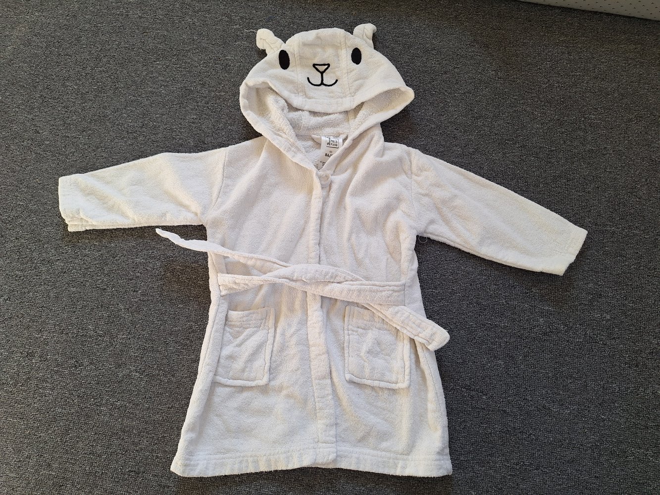 Weißer Bademantel mit kleiner Lämmchenkapuze, Gr. 86/92 aus 100 % Baumwolle.