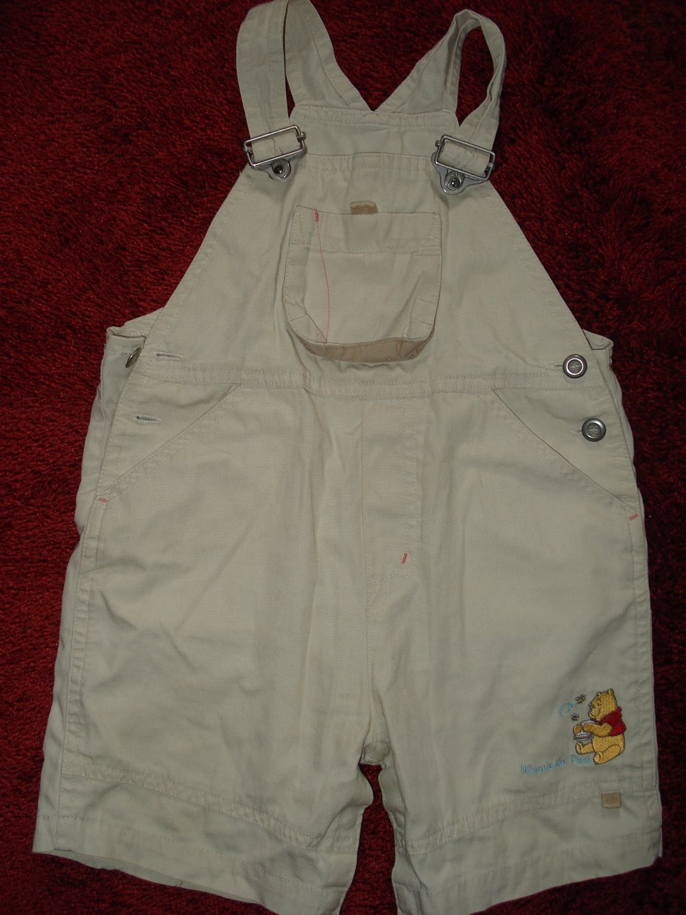 Diese kurze sandfarbene Latzhose von Disney in der Größe 86 hat vorn und hinten eine niedliche Winnie Puuh-Applikation. Hinten ist ein kleiner dunkler Punkt über der einen Tasche (siehe Foto). Ansonsten super bequem zum Rumräubern und/oder für die Kita.