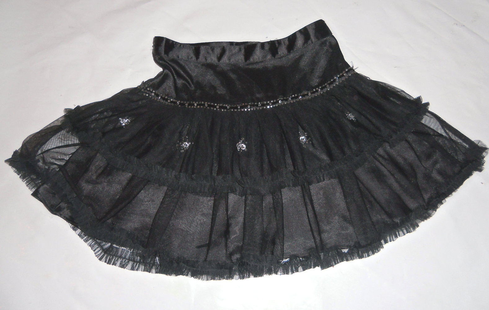 wirklich schöner schwarzer Rock mit 2 Voilants aus Tüll und Borten, dazu eine Borte ringsrum mit Pailetten und Glitzersteinchen und der obere Tüllvoilant ist mit Glitzersteinen,Pailetten und Perlen verziert.verstellbarer Innenund und Reißverschluß,wirklich schön, getragen ober ohne Fehler.Nichtraucherhaushalt haben aber Samtpfoten als Mitbewohner