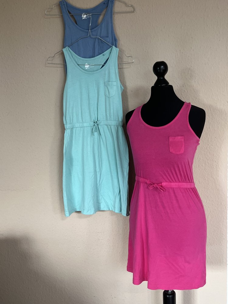 3 leichte Kleider von Alive Gr.134/140 blau pink türkis, Mitte raffbar, Ringerrücken. Wurden für den Urlaub gekauft und nur das blaue davon wurde letztendlich getragen