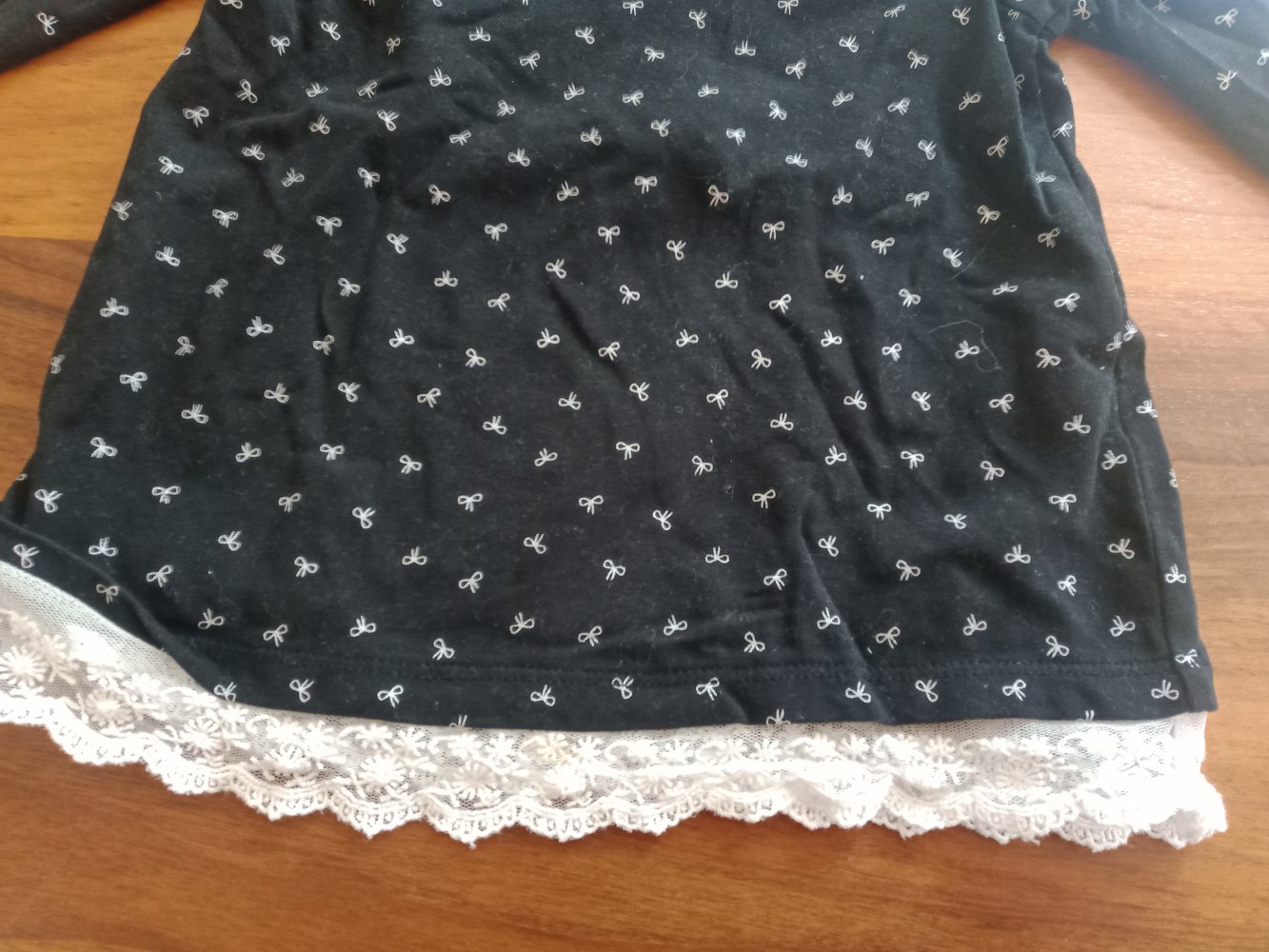 schwarzes Sweatshirt mit Schleifchenprint und Spitzenborte, Gr. 86