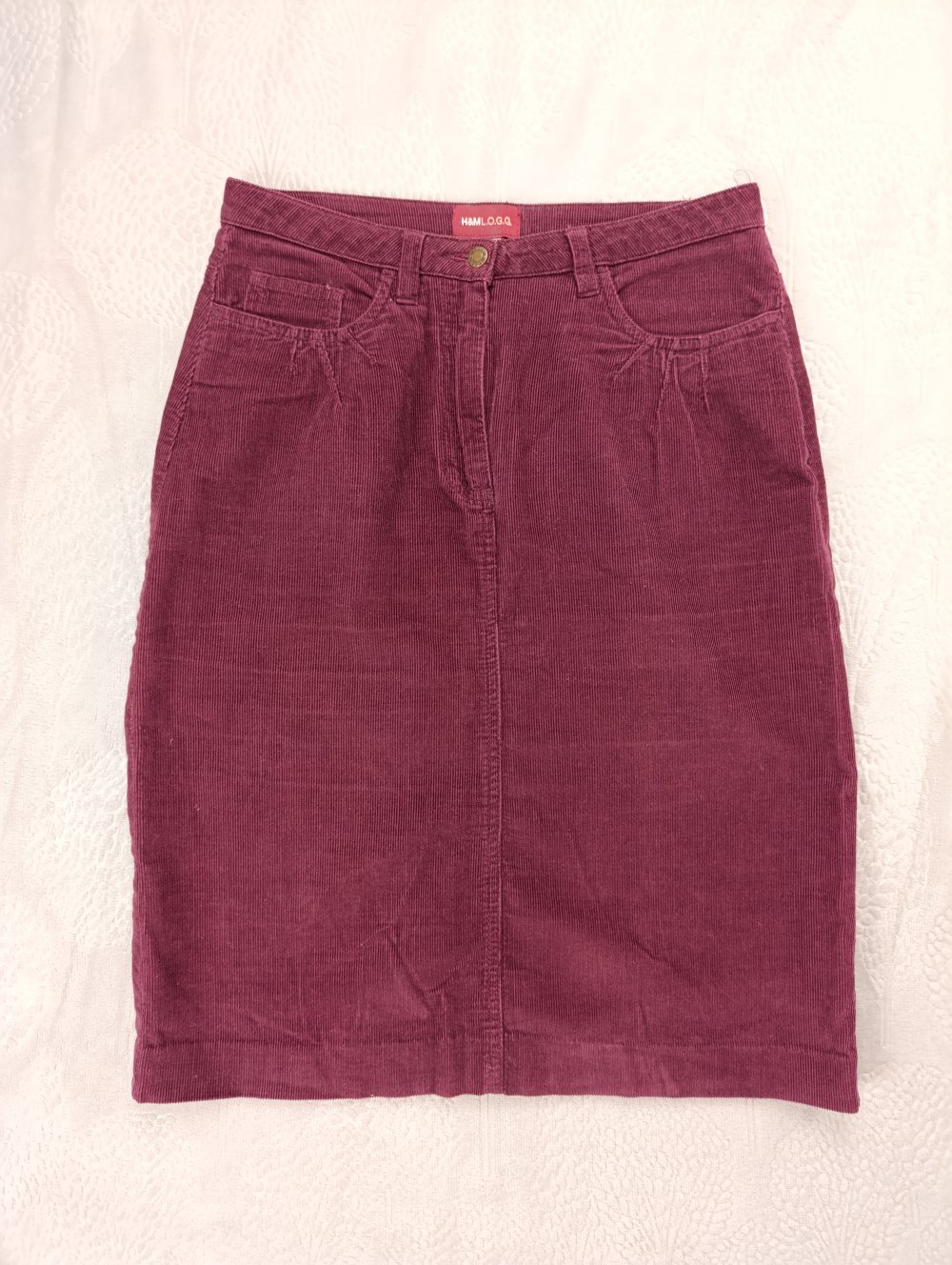 Zum Verkauf steht ein wunderschöner, knielanger Cordrock von H&M L.O.G.G. in einem tiefen, satten Bordeaux-Ton (oder Beeren-Ton).