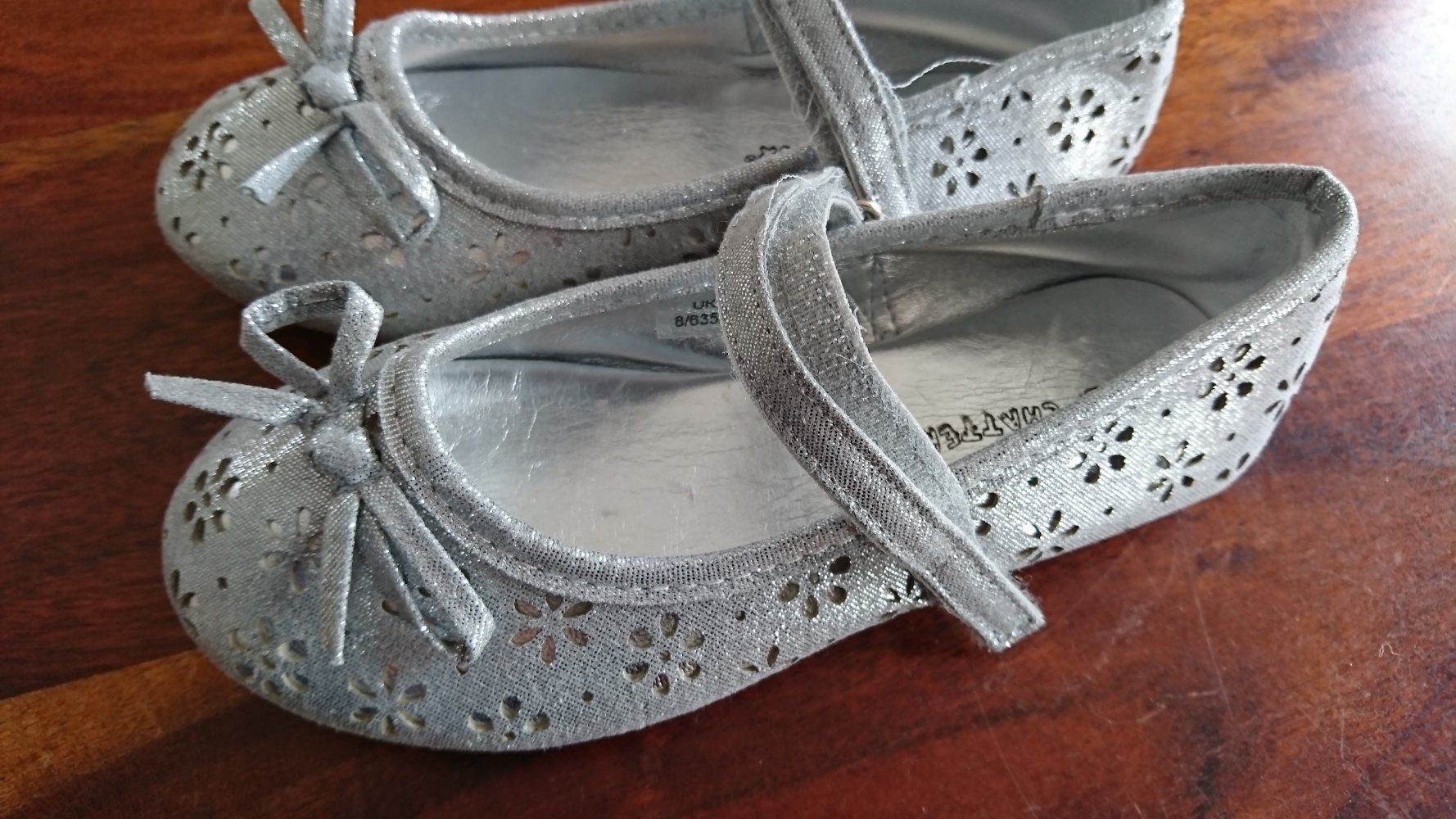 silbern glänzende / glitzernde Ballerinas mit kleinen Schleifchen vorn und Blümchen Muster (ähnlich Lochstickerei), mit Klettband zu schließen, UK Gr. 11 entspricht Gr. 29, fallen schmal aus, neu und ungetragen!