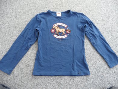 schönes Langarmshirt in knallblau mit Applikation Pferd. Fällt wie immer etwas kleiner aus. Guter Zustand mit leichten Waschspuren