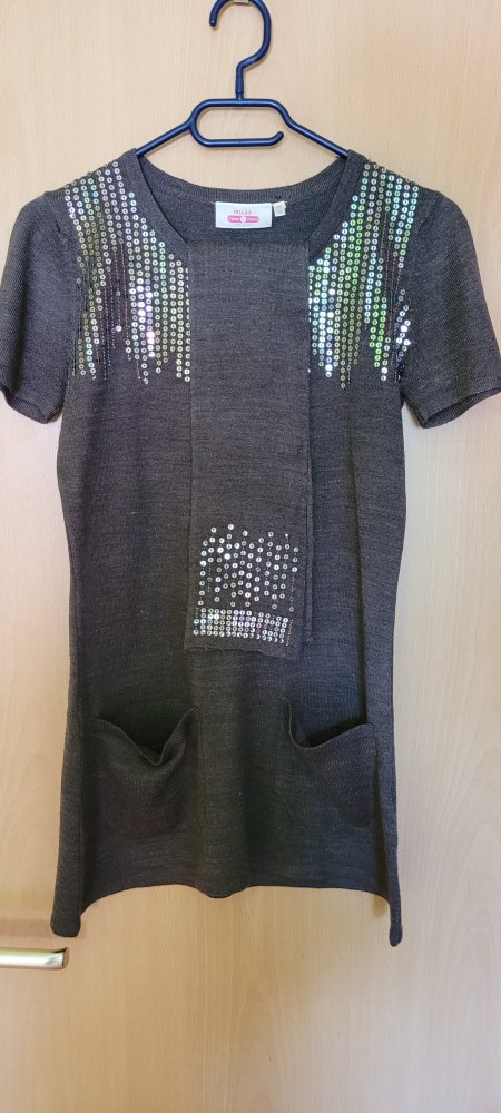 Graues Oberteil mit Pailletten und passendem Schal von der Marke "miss" in der Kindergröße 158/164. Kaum getragen, sehr guter Zustand.