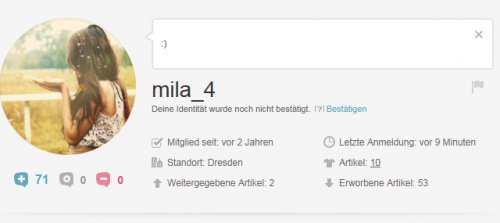 Mila94 Stadt : Dresden - Deutschland Letzte Aktivität : 17.04.2015 Mitglied seit : 28.10.2014 Besucher : 7524