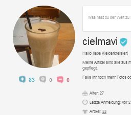 Ich bin von Kleiderkreisel gewechselt. Ihr findet mich dort unter gleichem Profilnamen und könnt auch meine 83 positiven Bewertungen ansehen.